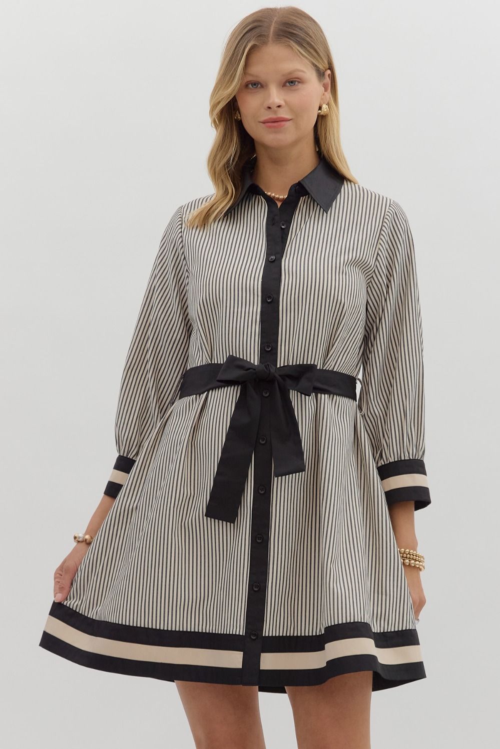 Stripe pattern ¾ sleeve mini waist tie mini dress featuring contrast collar band button front closure with multicolor sleeve band and hem detail. Lined. Woven. Non-sheer. Lightweight.