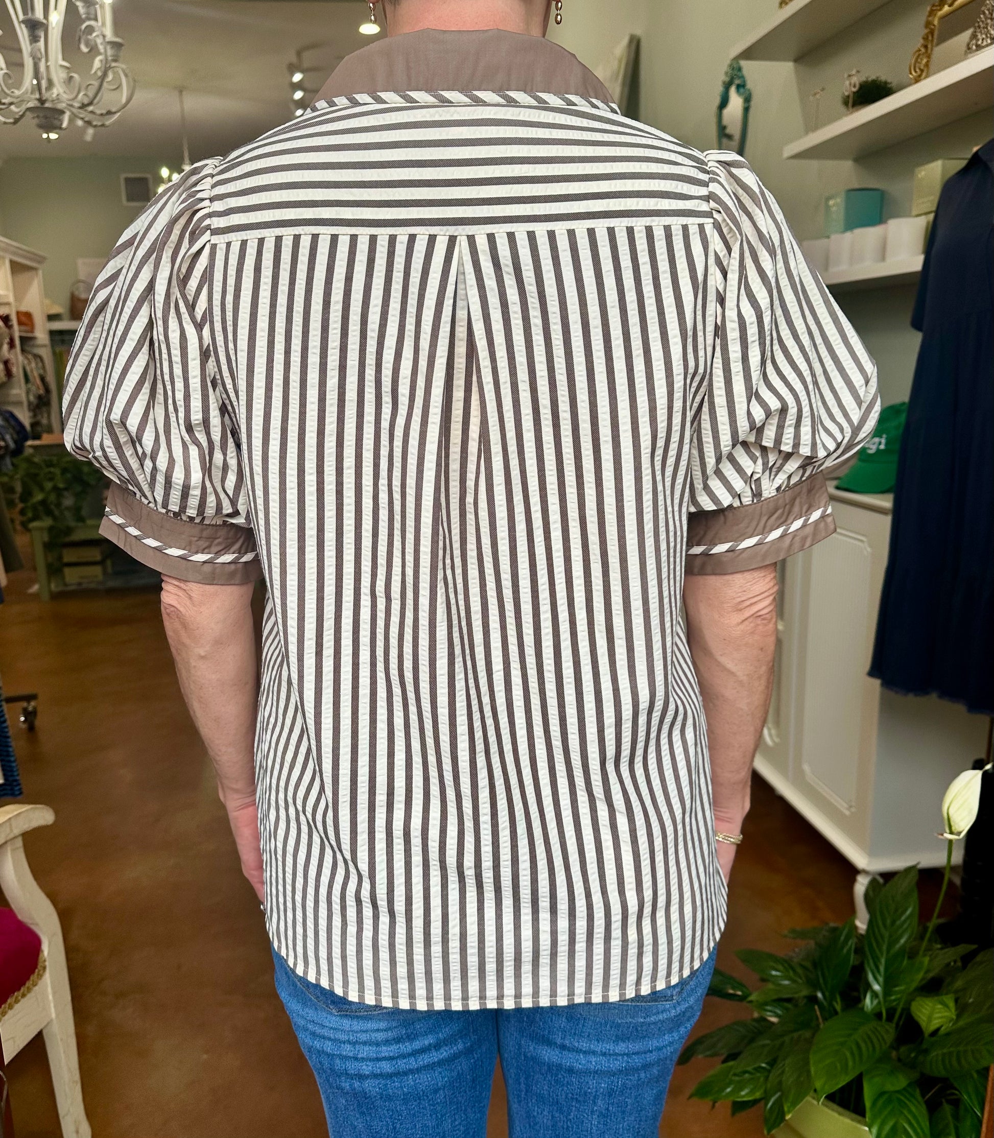 Stripe pattern contrast cuff band puff sleeve featuring contrast split collar pullover top. Unlined. Woven. Non-sheer. Lightweight.